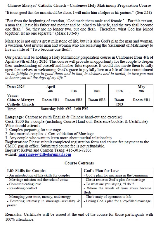 Inquiry 查詢:Kelvin and Carmen Tsang: 416-301-7283email address 電郵: marriagejoyfilled@gmail.com